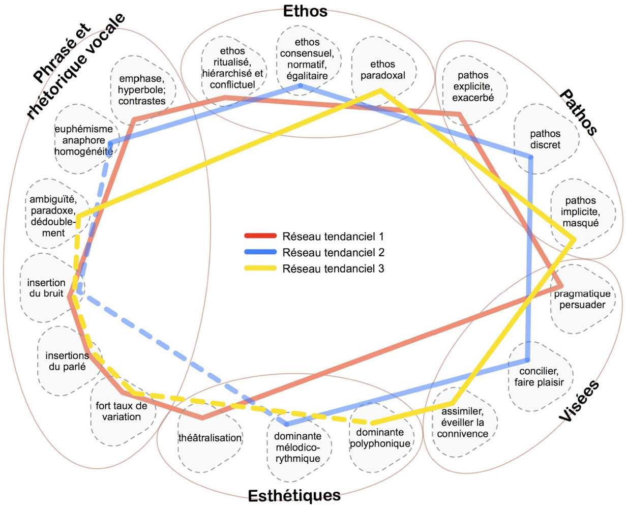 Figure 33. Schéma reprenant les principales caractéristiques des trois réseaux tendanciels, regroupées selon cinq catégories (phrasé et rhétorique vocale, ethos, pathos, visées, esthétiques).