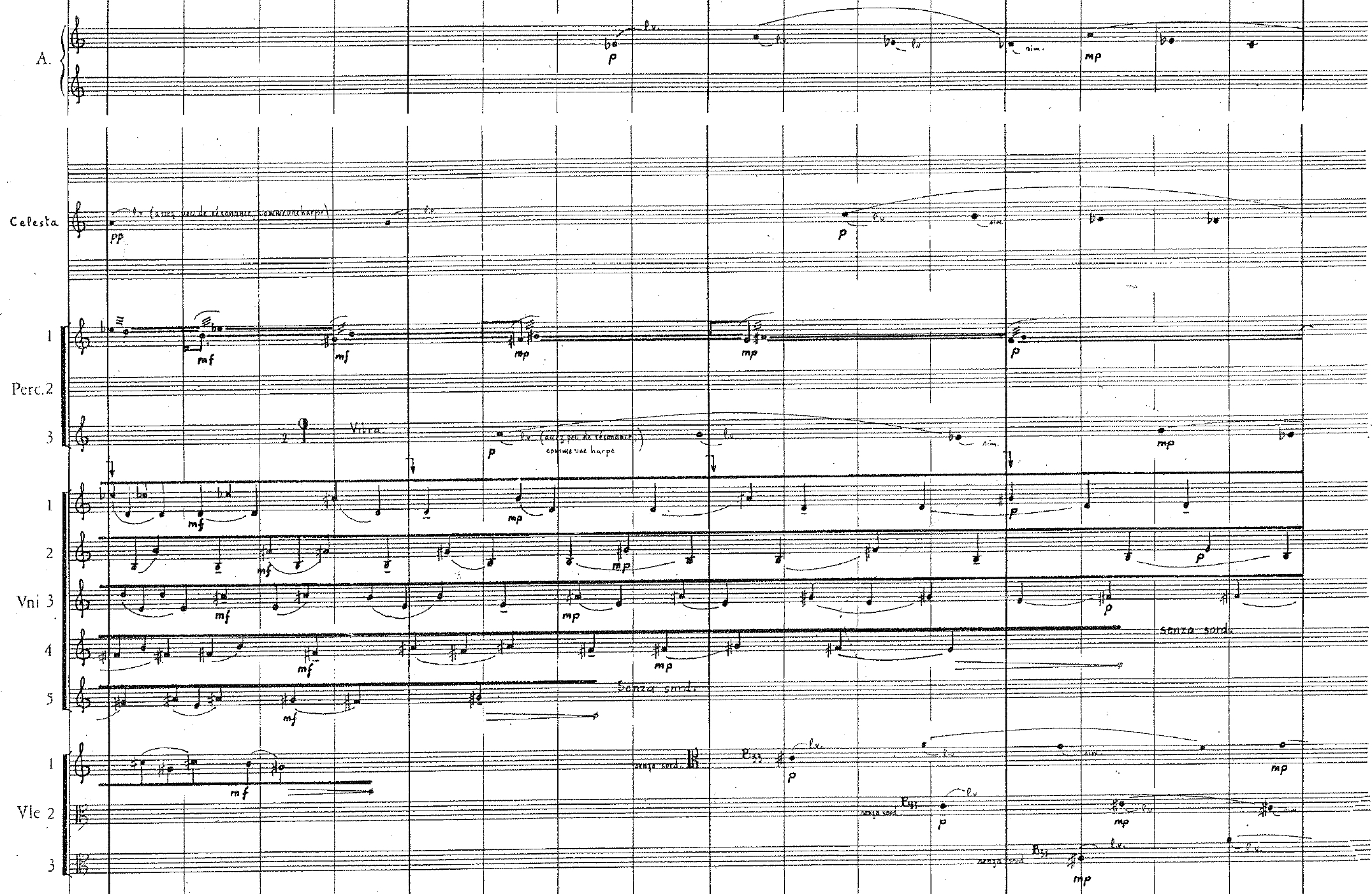 The change in this texture happens, as before, via an accumulation of parts, a widening of the range and an increase in the degree of polyphonic perceptibility (Example 10). However, this does not come about from within the initial parts, which remain weakly individuated, but by the addition of a second group of parts that differs radically from the first via the use of plucked sounds (low strings, harp) and resonant sounds (celesta, vibraphone, marimba). Within this ensemble, the points that accumulate and contract are mixed together in the same manner as Ligeti; in other words, the two groups are once again made up using two superposed “meta-instruments”, so that the polyphony unfolds on two levels: one, internal, weakly determined, allowing for a heterophonic meshing; the other, external, enabling the clear articulation of two strata.