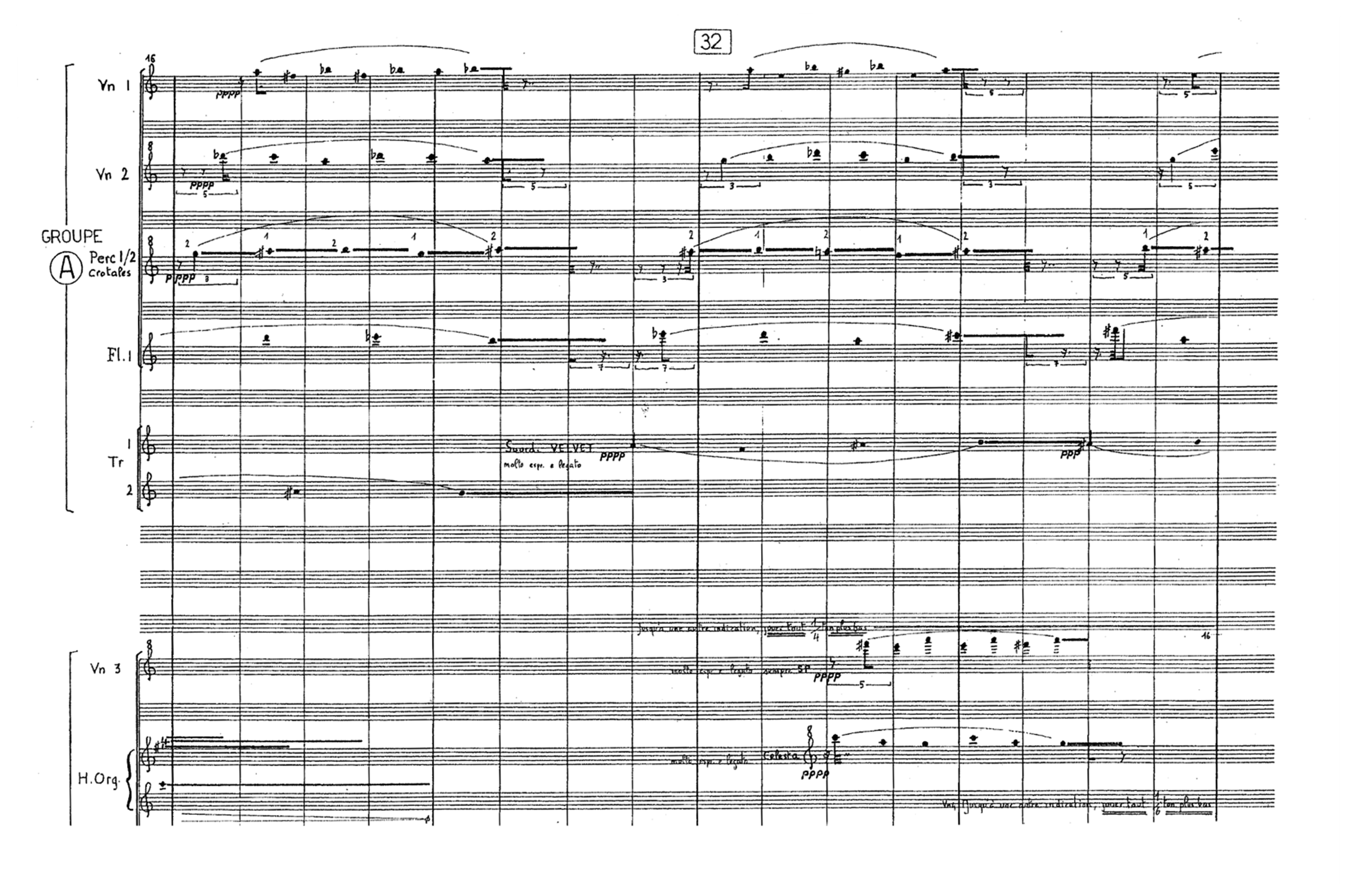 This meta-instrumental grouping is found at an unequalled level of systemisation in the chord-blocks that appear later in Modulations. However, this is initiated by another remarkable polyphonic passage (figures 31 to 39, Example 11), whose aim is unique in Les Espaces Acoustiques. To make the subsequent process of “coagulation” more striking, Grisey starts here with the most conventionally polyphonic texture of the cycle. The score is divided into four instrumental groups made up of similar instrumentation. But these groups do not, at this stage, have the unifying function of meta-instruments, for the internal principle that governs them stems from the individuation of the lines: firstly, through the highly differentiated timbre, and secondly, and more importantly, through the rhythmic differentiation of the parts, which is closer to traditional counterpoint than the previous examples.