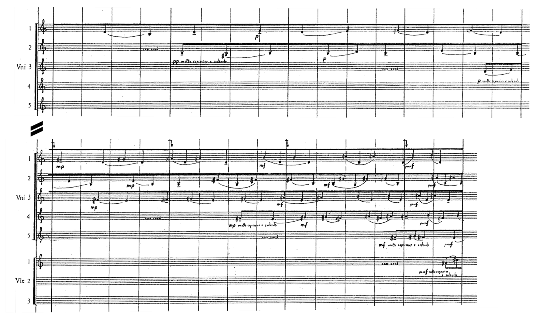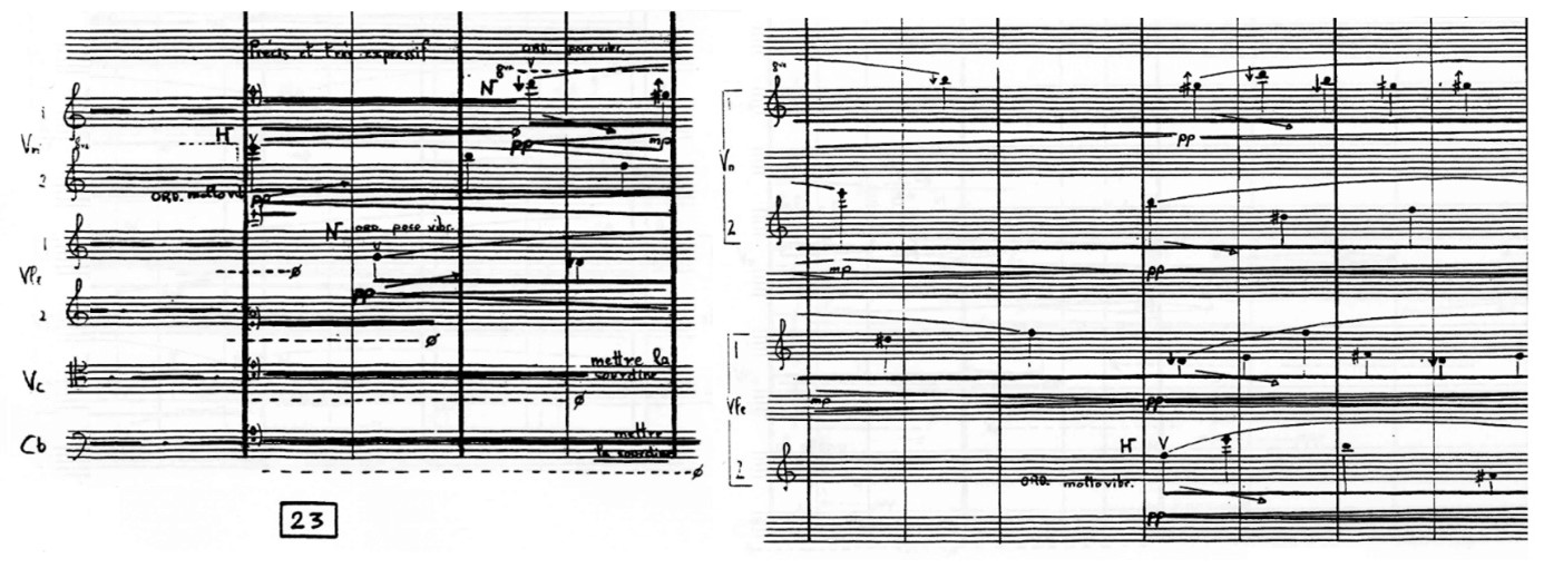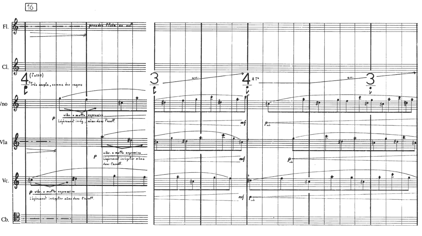 In the second example, this effect is partly achieved by the pairing of instruments that are intended to be heard as one, as the composer specifies in the score. The different pairs, which share the same pitch range, alternate throughout the passage and should “emerge slightly from the polyphony”, as indicated by the markings borrowed from serial language, Hauptstimme (main voice) and Nebenstimme (secondary voice), which here distinguish the first pair (violin 2 and viola 2) from the other instruments. However, this indication alone does not change much in the overall indistinctness of the lines, which is due to the four factors given above – again two contradictory paradigms – and through which a hybrid between melody and polyphony is produced, very much in keeping with Grisey’s aim, acting here on two interconnected levels: the “meta-instrument” formed by two instruments, producing an initial melodic-polyphonic hybrid; the ensemble of these “meta-instruments” and the others, forming a second, more complex melodic-polyphonic hybrid.