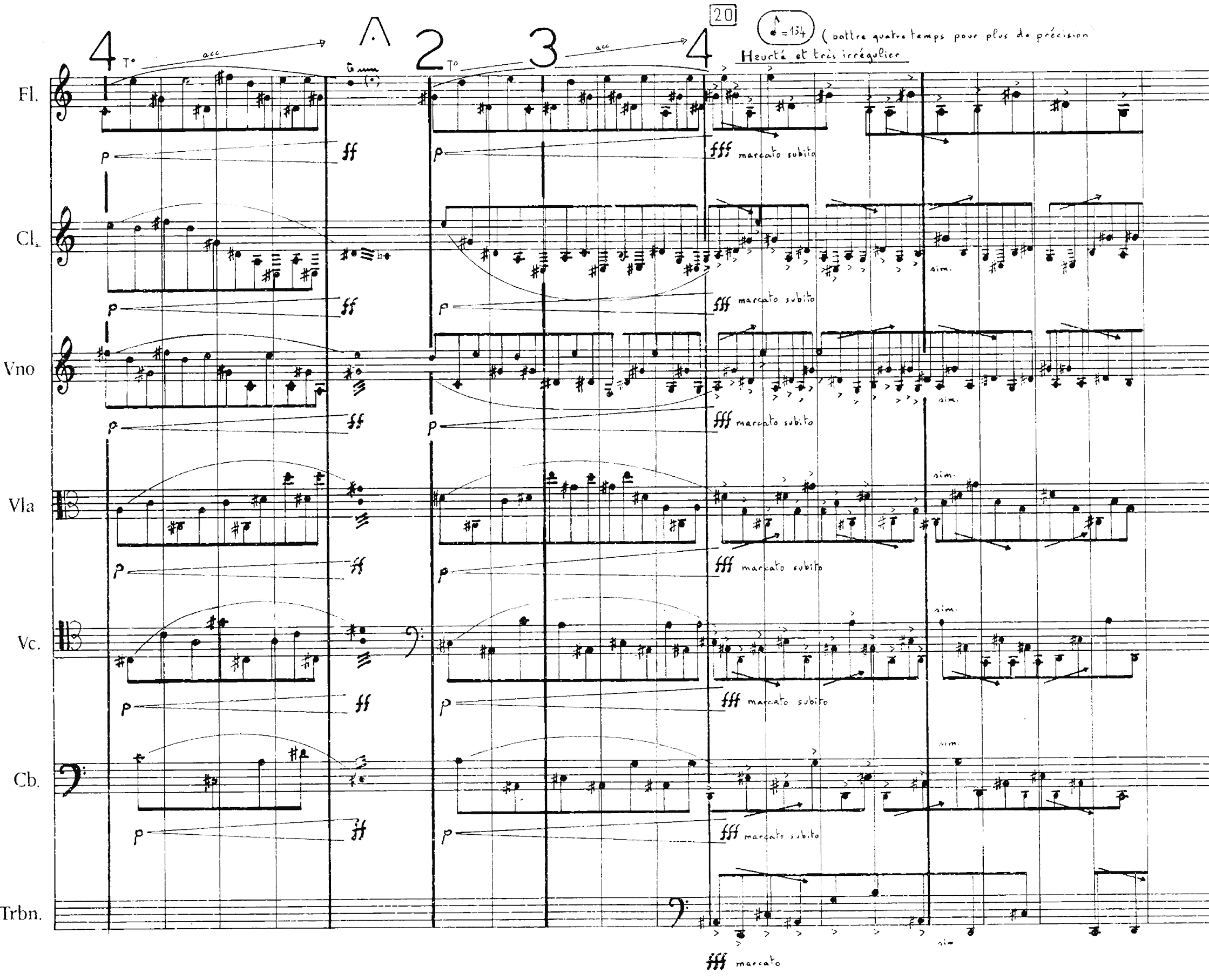 The changes in the textural parameters lead, in both cases, to a gradual individuation of the voices, gradually bringing the sound paradigm closer to a more conventional polyphony, as the sole example in the Périodes movement will suffice to show (Example 8). The timbres are now distinct (especially the trombone, which is hardly suitable for fusion) and are made richer by the fff dynamics. Compared to the beginning of the passage, where the intervals remain equally disjunct in absolute terms, these differences diminish from a perceptual point of view as the extension of the overall range shifts the weight of the contrasts onto the differences in registers (low-mid-high); each part, or at least each group of parts, has a differentiated sound space. On the other hand, the increase in tempo favours melodic continuity within each part and the articulation of points of convergence or quasi-interaction between the voices (moving from diagonal layering to vertical superimposition), which are otherwise differentiated by distinct rhythmic values.